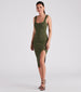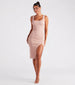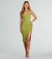 Strut it out in a knit midi dress that is perf for every day! Designed with a ribbed knit fabric. this dress offers a form-hugging fit with a moderate stretch. It features a sleeveless square neckline. tank shoulder straps. a high side slit accented with glossy metal buttons. and a midi-length hem. Complete the look with mules.