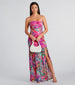 Arrive at your destination in this tropical maxi dress looking stunning and ready for fun! The maxi dress features a strapless neckline. non-slip grip lining. flexible boning. a form-hugging fit. and an effortless high front slit and ruffled flowy hem. Complete your vacation look with a handbag and sandals!