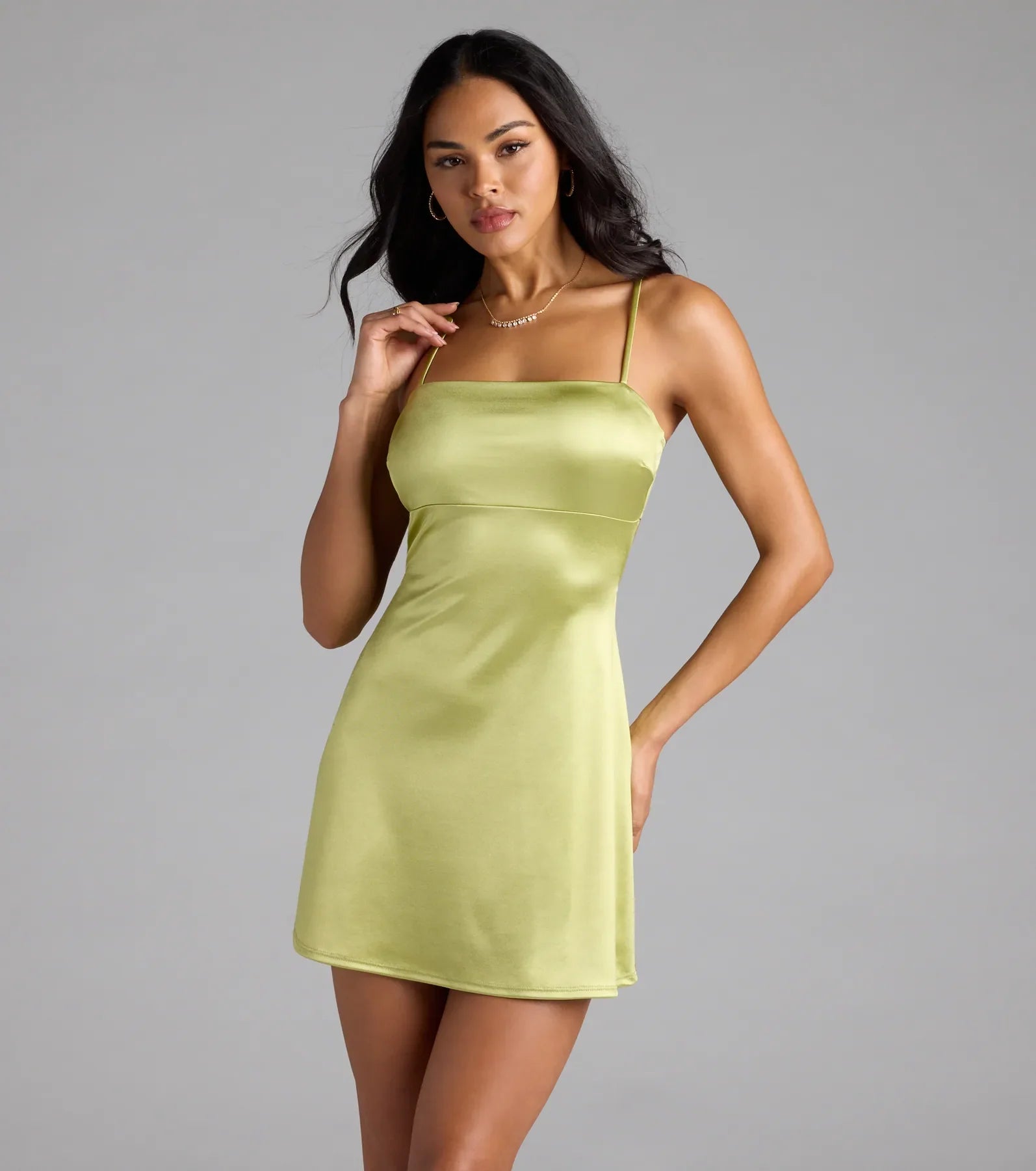 This silky satin mini dress is designed with a cutout back and sleek A-line silhouette for a stunning look!