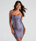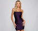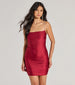 Keep it sophisticated with a satin mini dress that radiates luxe. The dress features a sleeveless square neckline. detachable rhinestone embellished spaghetti straps. ruched side and back seams. and a form-hugging silhouette and mini-length hem. Complete look with rhinestone heels and a satin clutch.
