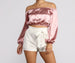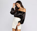 Bring the sophistication and stun them all in this mesmerizing top! It features an elastic off the shoulder neckline. long flowy sleeves and a cropped hem. Top is composed of a satin-like fabric that offers a relaxed fit with a minimal stretch.