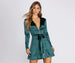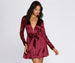 Keep it stunning with a luxe statement! This trench dress features a plunging V neckline. fitted long sleeves. a zippered front. a tie waist belt and a flared skater silhouette. Dress is composed of a satin-like fabric that offers a form hugging fit with minimal stretch.
