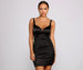 Stun in a satin mini dress that showcases curves in all the right places! The dress features a sleeveless wired v-neckline. padded cups. supportive shoulder straps. ruched side seams. and a mini length silhouette. The dress is composed of a smooth satin-like fabric that offers a form hugging fit with a moderate stretch. Complete look with mules and a rhinestone clutch.