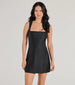 Style up this slinky knit mini dress featuring a sleeveless square neckline with tank shoulder straps and a short-length hem with a flirty A-line silhouette. Complete your look for a girl's night with stiletto heels.