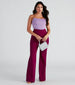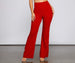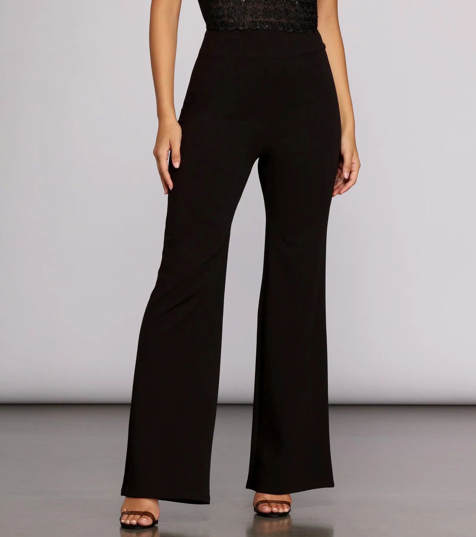 These high waist. wide-leg pants are so ready for you to style and make chic! Create stunning workwear outfits or dress up these pants for a formal date night. The pants feature a high-rise waist. straight legs that flare at the hem. and are composed of a stretchy crepe fabric that accentuates curves. Complete your look with a beaded sweetheart bustier and trendy block heels.