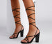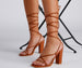 Hey babe. showcase your chic style with these faux leather heels! They feature an open square toe. a thin strappy lace-up design. and a block heel. Pair these shoes with a casual dress and a cute blazer.
