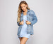 Showcase your status as a total stylish babe with this on-trend denim jacket! It features an oversized fit with a collared neckline. long sleeves. a button-down front. two buttoned chest pockets. two lower front pockets. distressed detailing. and a relaxed fit. Layer this light wash denim jacket over a graphic tee and black skinny jeans.