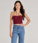 A sleeveless crop top features a halter neckline with a spaghetti strap tie and a flattering cinched bust to create a flirty look. Pair with a denim mini skirt for any plans.