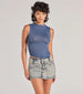 A sleeveless crop top features a sleek mock neckline. a side ruched seam to accentuate your curves. and an asymmetrical-cut hem. Style with high-rise jeans or a skirt for any occasion.