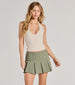 A stylish mid-rise skort designed with a pleated skater skirt overlay for an adorable touch and fitted woven shorts to give coverage. Pair with knee-high boots.