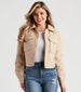 Keep stylish through the chill in this quilted puffer jacket featuring long sleeves with buttoned cuffs. a collar neckline. snap-button down front closures. flap pockets. and a cropped hem. The jacket is designed with thin insulation to help keep you comfortable and protected from the elements. Style over a long sleeve top with woven joggers.