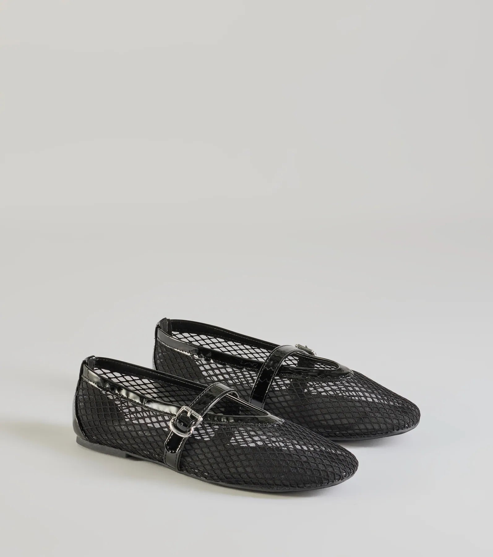 Show off your it-girl style with these trendy ballet flats featuring a sheer mesh fishnet design. a closed round toe. and an adjustable strap. Pair with a chic shoulder bag.