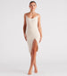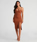 This stylish midi dress entered the chat! It features a sleeveless V-neckline with trendy chain link shoulder straps. a bodycon silhouette. and a front slit on stretchy. double-lined ribbed knit fabric. Complete the look in clear strap heels.