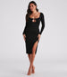 This long sleeve midi dress is such a stylish staple! Featuring a square neckline with a chic center cutout at the bust. long fitted sleeves. a midi-length hem with a front slit. and a form-hugging fit. this crepe dress can be styled up or down. Pair with strappy mules for a date night.