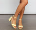 Slay in stylish strappy heels! The heels feature a closed-back. an adjustable ankle strap. criss-cross straps. an open almond toe. and a low block heel. The heels are composed of a faux leather material. Complete look with a jumpsuit and charm necklace.