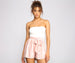 Stun with a striped romper that channels those stylish vibes! The romper features a strapless square neckline. a tie-waist belt. and striped wide-leg shorts. Complete your cute brunch outfit with a pair of wedges and sleek hoops.