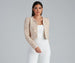 Showcase stylish sophistication with this posh tweed blazer. It features shoulder pads. long sleeves. an open front with hook and eye closures. and a cropped. form-hugging fit. The tweed fabric has pretty metallic sparkles embroidered throughout. Layer this blazer over a basic bodysuit and complete the look with high waist dress pants and clear mules.