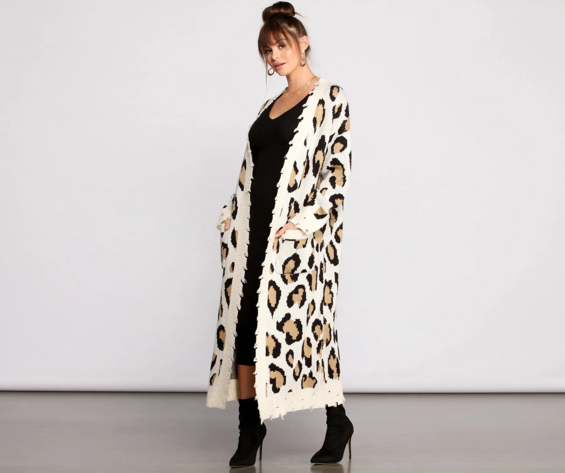 Layer on this stylishly spotted leopard print duster to get a trendy chic look! It features a long flowy fit with a cool distressed hem. Pair over a midi sweater dress for an adorable look.