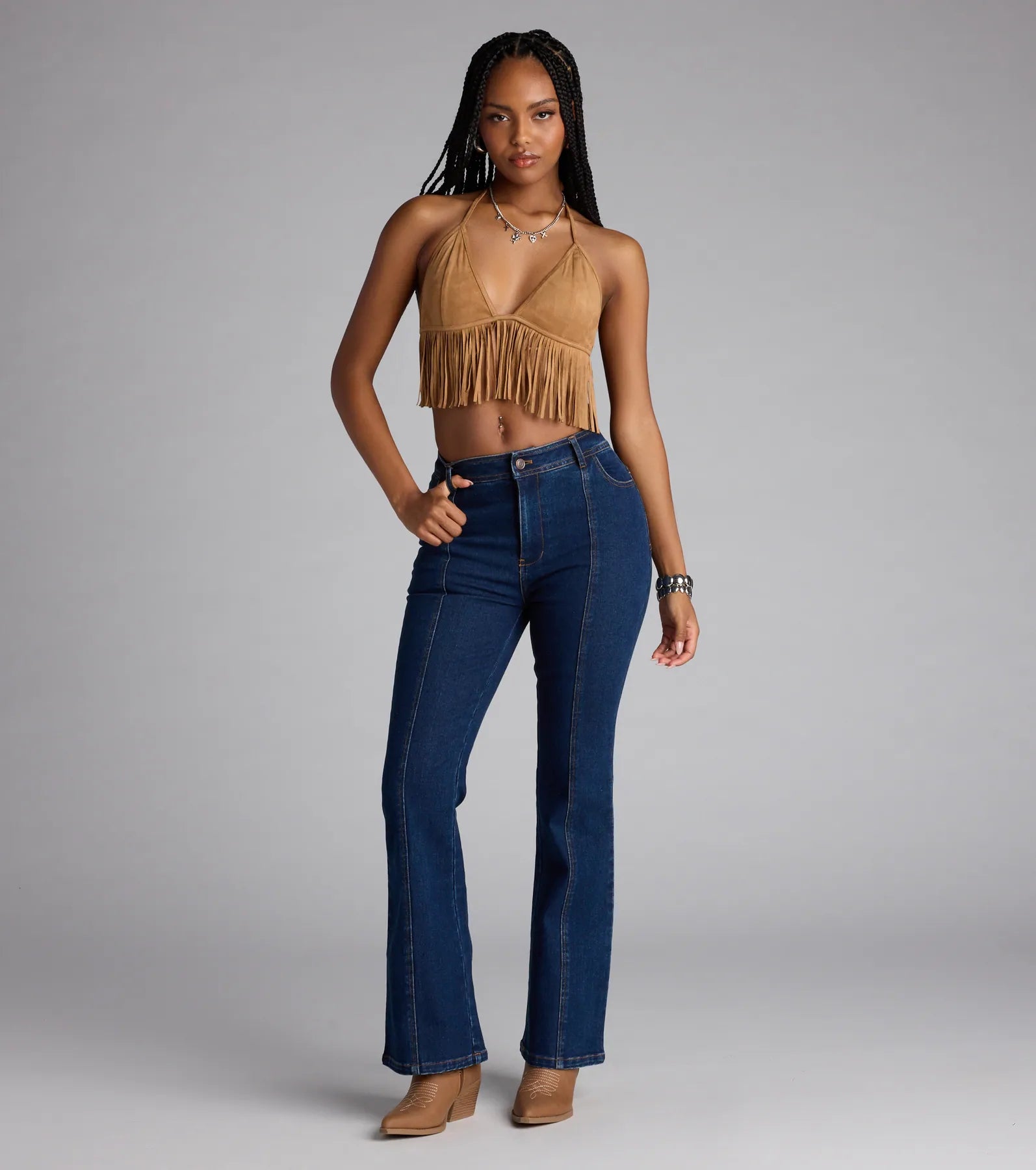 These mid-rise denim jeans said main character energy and meant it. With retro-inspired flare legs and star patch pockets. they're made for summer fun. house parties. and showing off socials!