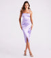 Unveil this satin midi dress for cocktail soirees and dressy rehearsal dinners! The dress features a sleeveless square neck. spaghetti straps that lace up on the back. a bodycon silhouette. and a side pleated seam that creates the faux wrap skirt. The silky smooth satin fabric offers a moderate stretch. Complete the look in block heels.