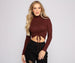 Get a trendy vibe in this adorable ribbed knit crop top! It features a mock neckline. long fitted sleeves. and a cropped hem with a front drawstring to cinch. Pair this top with high rise faux leather joggers for a stylish and edgy feel.