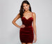 Hey babe. showcase a sultry-chic look in this luxe velvet mini dress! It features a sleeveless sweetheart neckline with wired cups. spaghetti straps. a corset-designed bodice with flexible boning for structure. ruched detailing down the sides and back. and a short. curve-hugging silhouette. Style this dress with hoop earrings and block heels.