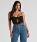 You'll love the sultry details of this chic lace-up corset top. It features a sleeveless sweetheart neckline. underwire cups with a built-in padded bust. adjustable spaghetti straps. and a lace-up with tie closure on an angled cropped hem. Pair this top with trendy vintage-style jeans.