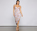 Keep your summertime look sexy and chic with this sultry floral midi dress. It features a sleeveless V-neckline with spaghetti straps that can be worn in a front cross-strap design. an open back with a tie detail. ruching. and a mid-length. curve-hugging silhouette with an asymmetrical hem. Style this dress with sleek hoop earrings.