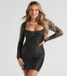 This sultry bodycon dress will bring the glitz and glamour to your date night 'fit! Featuring a ruched sweetheart neckline. sheer long fitted sleeves. and a short. curve-hugging silhouette. this dress will keep all eyes on you. Complete the look with embellished heels.