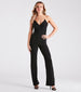 Make it a sultry night out with this bold curve-hugging backless jumpsuit. It features a sleeveless V-neckline with a wrap-front. detachable thin wire straps that lead to an alluring open back with a chic cross-back wire strap design. a high waist seam. a hip-hugging fit. and flared pant legs. The smooth knit fabric offers plenty of stretch. Style with hoop earrings and platform heels.