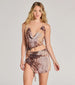 Keep your club 'fits oh-so-sultry with this abstract print mini dress that will capture all the attention. The airy mesh fabric showcases an abstract multi-print pattern for that trendy girl vibe and includes a knit lining for coverage. The mini-length dress features a sleeveless cowl neckline. tie-back halter spaghetti straps with front O-ring accents leading to an open back. and an alluring asymmetric waist cutout with a larger O-ring accent. The front ruching will accentuate your curves. leading to a front slit with a flirty ruffled trim. The bodycon silhouette will flaunt your stunning figure. Style this going-out dress with hoop earrings and stiletto heels.