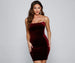 This sultry velvet bodycon dress is a must-have for creating a luxe look for a night out! It features a sleeveless square neckline. spaghetti straps. an open back with a lower strappy design. and a short. curve-hugging silhouette. Complete the outfit with sparkly heels.