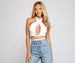 Bring the sultry vibes to your night out look with this trendy crop top! It features a sleeveless halter neckline with straps that cross at the front. a center front cutout at the bust. and thin straps that wrap around and tie at the waist. Style this top with high-rise denim and chic mules.