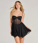 Serve up sultry vibes in this chic skater dress designed with a sheer lace corset bodice and lined mesh skirt. The short dress features a sleeveless sweetheart neckline with a lined and padded bust. underwire and flexible boning for structure. a trendy V-shaped waist. and a flirty skater silhouette with an uneven hem and dainty lace trim.