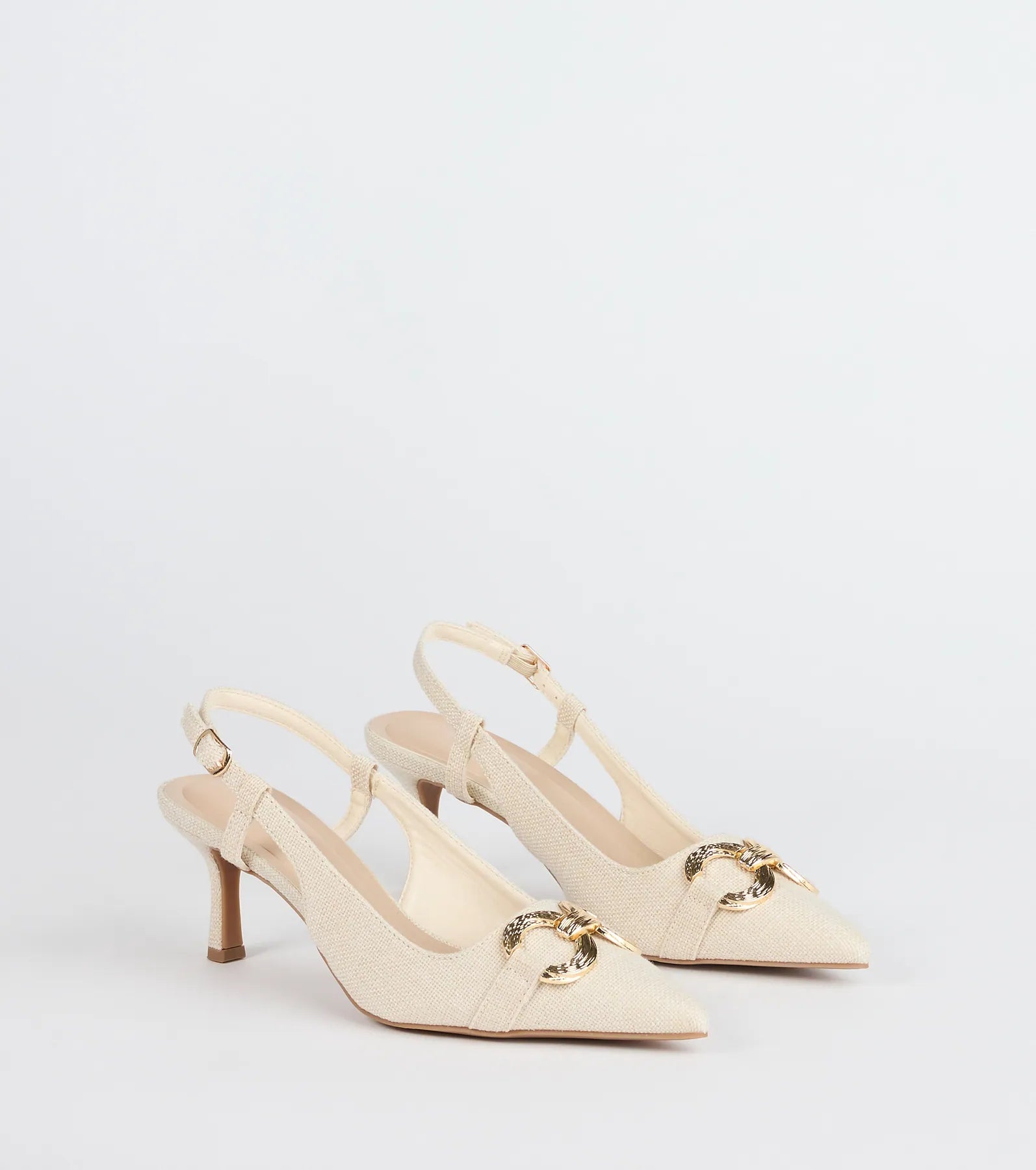 These slingback stiletto pumps will be your new summer fave. designed with circular buckle accents and chic linen material.