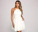 This flirty sleeveless skater dress will have you totally summer-ready! It features a high square neckline. spaghetti straps that lead to a cross-back design. a fitted bodice. a high waist. and a short skater skirt. Complete the look with gold hoop earrings and cute wedges.