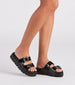 Show up this season with a trendy summer style in these sleek and strappy platform sandals. They feature a round toe. a dual adjustable strap design with buckle and stud details and a patent faux leather sheen. an open back for easy on-and-off styling. and an edgy platform lug sole. Pair these sandals with a graphic tee and distressed denim shorts.