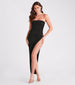 If sandy beaches are what you seek this maxi dress is ready for fun under the sun! It features a strapless neckline. a side O-ring metal insert atop the sexy high slit. and a flowy long hem on slinky knit fabric. Complete the look in strappy sandals and sunglasses!