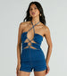Charm your way through the sunny season in this halter denim romper! Featuring a halter neckline and spaghetti strap ties for a sultry look. a lace-up cutout bust for added flair. and a form-hugging fit that flatters your figure along the short-length hem. Complete the look in platform sandals.