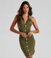 Sun's out. shoulders out! This halter mini dress is perfect for a sunny day out and about. It features a sleeveless bodice. collared neckline. a partial open-back. button-down front. and a bodycon silhouette on sweater rib-knit fabric. Complete the look in a dainty ring set.
