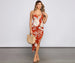 This dress will have you looking stunning as you watch the sunset on your next vacay! It features a sleeveless V-neckline. adjustable spaghetti straps. a beautiful tropical floral print. and a mid-length. curve-hugging silhouette with an asymmetrical hem. Style this dress with hoop earrings and strappy sandals.