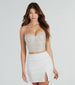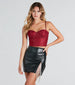 This gorgeous bustier makes for a glam surprise guest at parties! The sweetheart neckline and built-in padded underwire bust flatters and supports while the detachable and adjustable straps provide a perfect fit. This bustier crop top has finishing touches with front rhinestone embellishments. flexible boning. and a unique back with tulle glitter polka dots and multiple hook and eye closures. Complete the look in boyfriend jeans and mules!