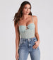 Watch everyone give you sweet affection for looking so stunning in this mesh crop bustier perfect for styling with your favorite denim! It features a sleeveless sweetheart neck with front lattice straps. adjustable spaghetti straps. a ruched built-in padded bust with underwire. a sheer bodice with flexible boning. and back hook-eye closures. Complete the look in flare jeans.