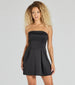 So sweet and sassy. this strapless skater dress is perfect for brides-to-be or any girl who loves a little white dress! Designed with a structured crepe fabric with ample stretch. this short dress will have you ready to twirl all night long. It features a strapless straight-across neckline with a flattering fold-over design. corset-style seams and a V-shaped high waist for a snatched fit. a secure back zipper closure. and a pleated skater skirt with a flirtatious fit and flare silhouette. Complete your gorgeous look with hoop earrings and platform heels.