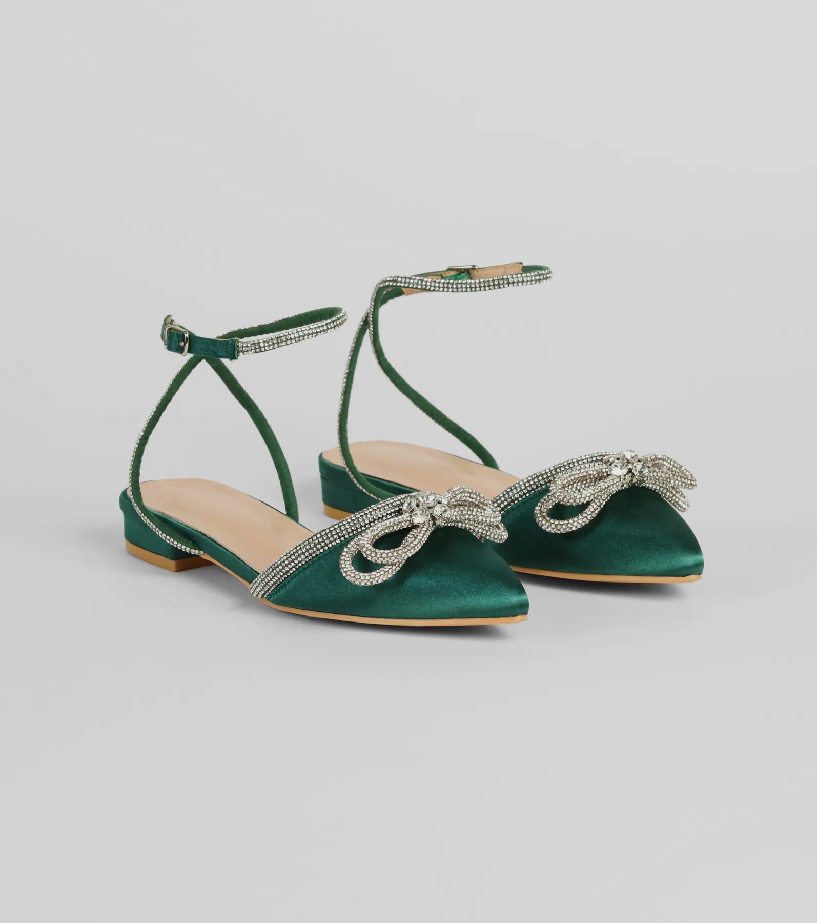 Treat yourself to the perfect touch of sassy style with these satin flats! They feature a closed pointed toe with a statement rhinestone bow and a rhinestone-embellished trim. an open design. a cushioned faux leather insole. and a rhinestone-embellished ankle strap with buckle closure. Complete the look with a fab ring set for a dressy dinner party or banquet!