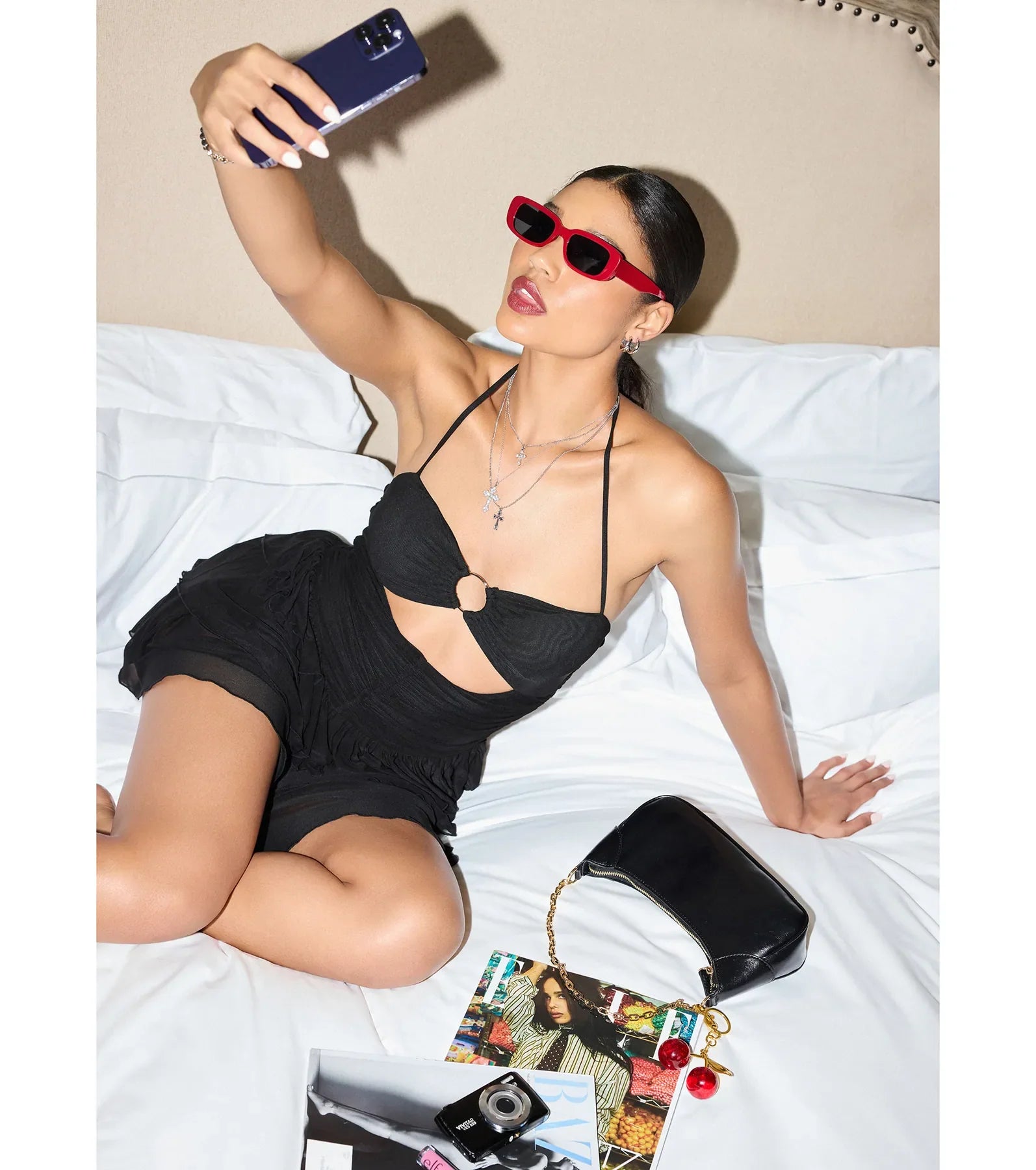 So flattering for a night-out occasion. this skater dress is featured in a flattering halter neckline with a chic hoop insert and a cutout bodice that shows some skin!