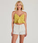 You'll radiate sweet charm in this babydoll crop top all season! With delicate spaghetti straps and a V-neckline. this top boasts a stretchy smocked bust that hugs your curves for a flattering fit. The lace-up back adds a touch of allure. while the ruffled cropped hem adds a playful touch. Complete the look in a denim skirt and block heels for any occasion!