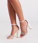 Sweet and dreamy. adorn your outfit with these block heels featuring an almond toe. faux pearl clear toe strap. a closed back. ankle strap. and adjustable buckle closure on faux leather material. Complete the look with a chic clutch purse.