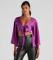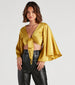 Want to know a secret? This sweet satin top can be worn multiple ways so you stun in every room you walk into! It features long kimono sleeves. a surplice v-neckline. and a customizable tie that can be styled in the front or back. Complete the look in faux leather pants.