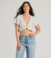 Sweeten your every day in this adorable flutter sleeve crop top on any casual occasion! Featuring playful flutter short sleeves. a trendy tie front design. and a cute ruffled crop hem. this top is perfect for adding a touch of fun to any outfit. Complete the look in jeans and block heels.